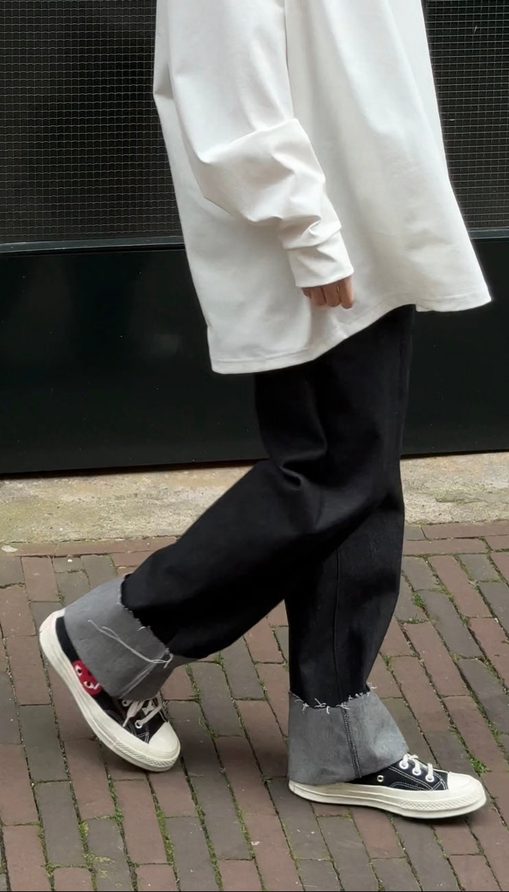 Met rechte, iet wat wijdere lange pijpen met grove omslag, een perfecte broek!